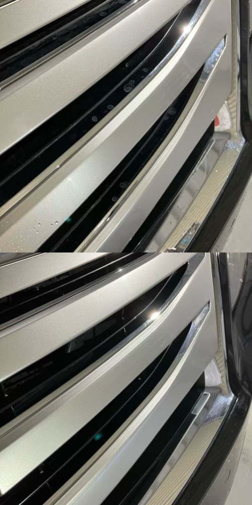 フロントグリルの水シミもしっかりと除去、ぱっと見の印象が全然違うと思います。